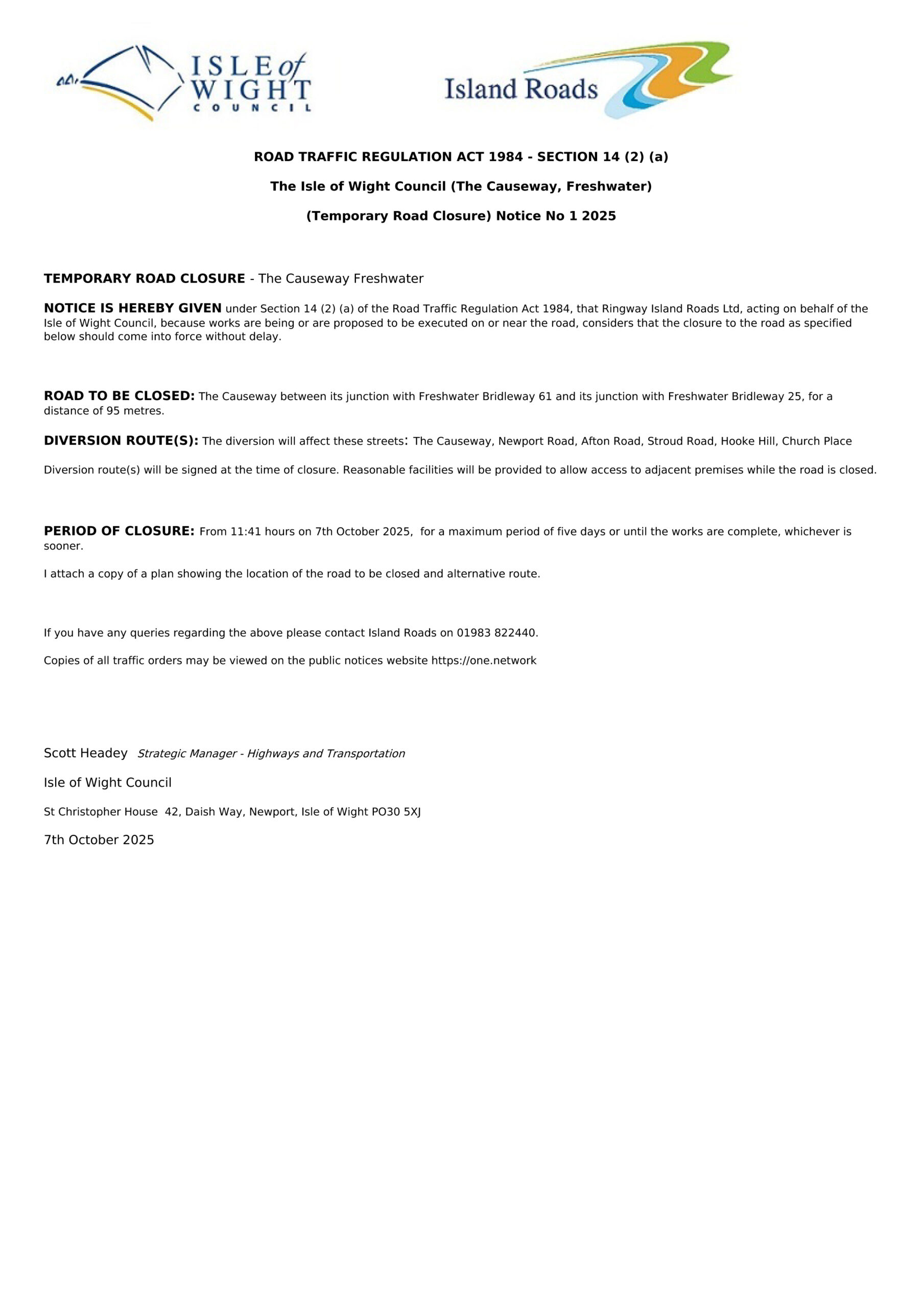 If you have any queries regarding the above please contact Island Roads on 01983 822440.
