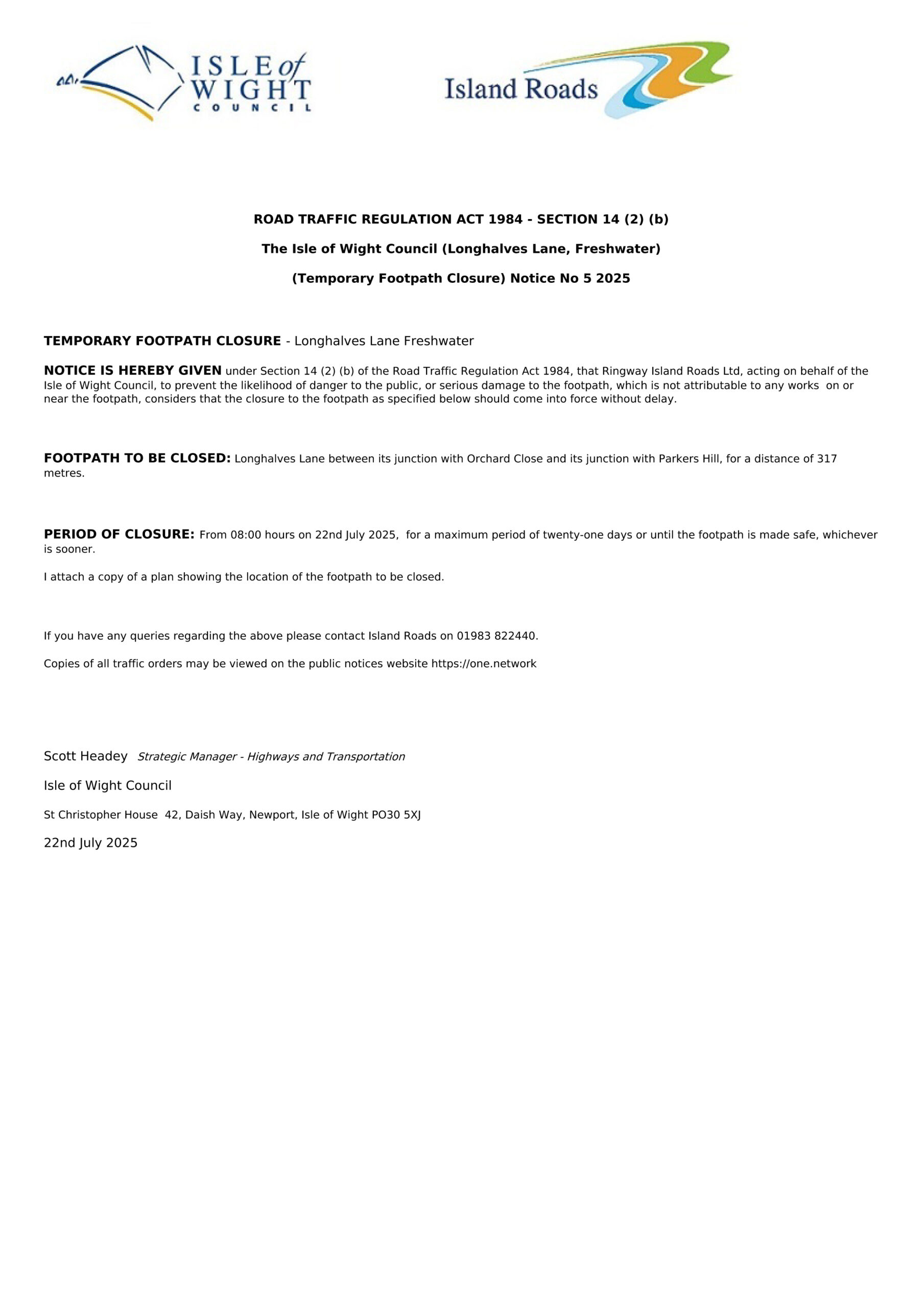TEMPORARY FOOTPATH CLOSURE – Longhalves Lane Freshwater