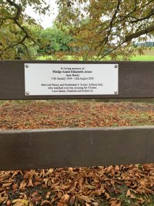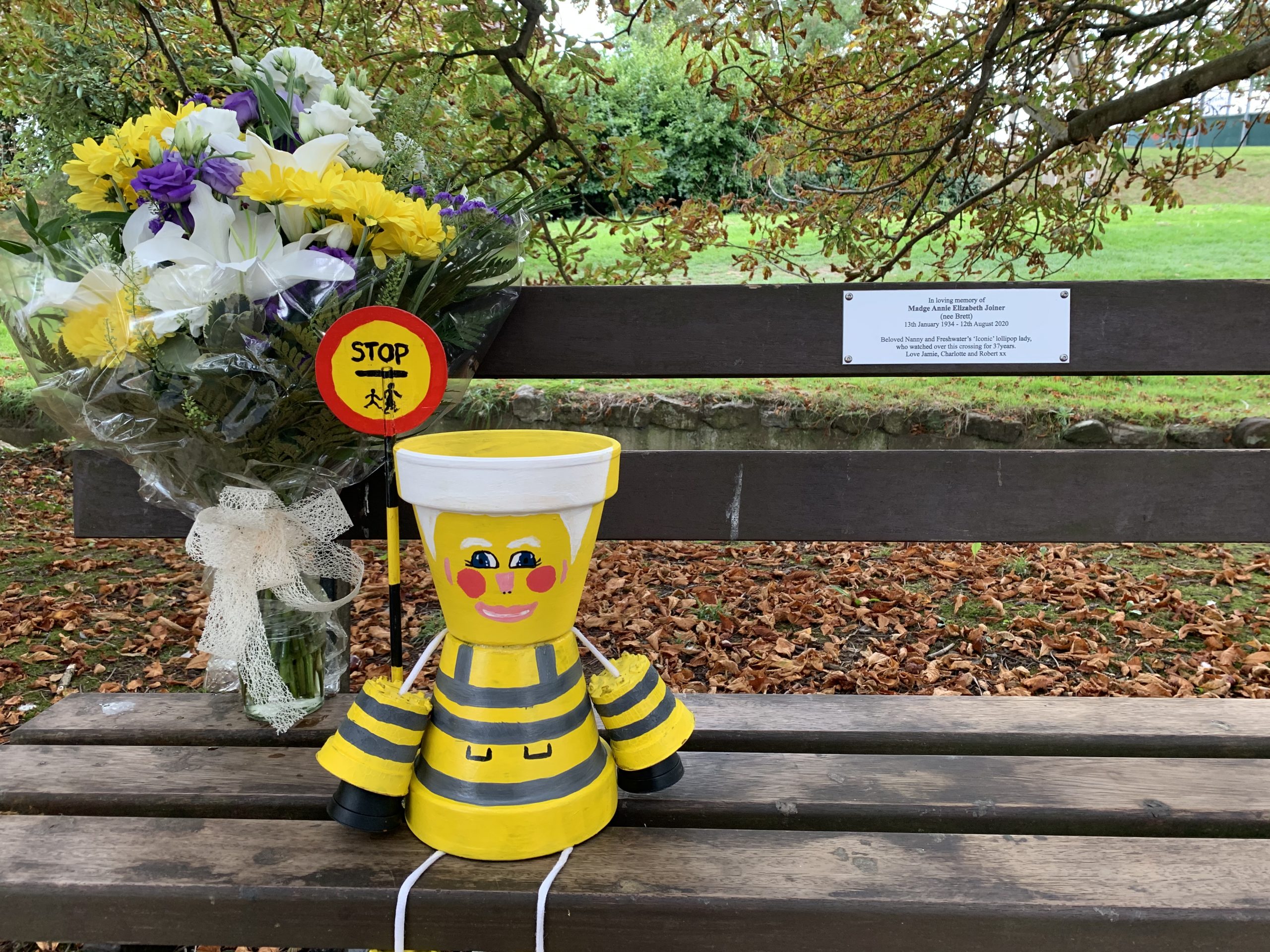 Madge Joiner – We thought you may like to see the wonderful plaque and flowerpot lollypop lady, placed by Madge’s family. Appropriately, it’s on the bench near the crossing.