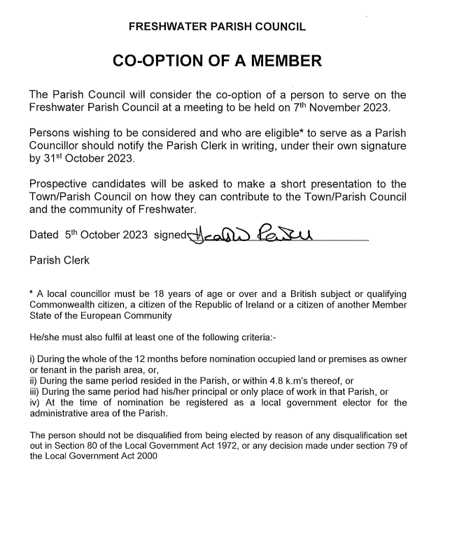 Parish Councillor – Vacancy Oct 5, 2023 | Freshwater Parish Council News Freshwater Parish Council currently has a vacant Parish Councillor position. If you are passionate about our local area and would like to use your skills and experience to improve our community, then please contact the Clerk by 31st October 2023.